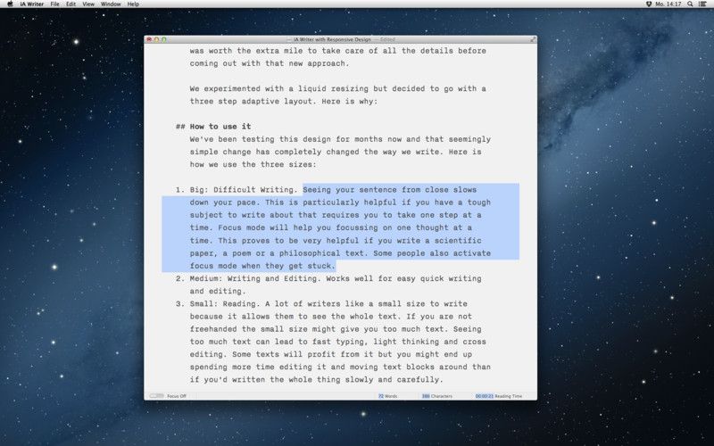 Writing with zero distractions. This app goes full-screen and strips out all of the menus present in conventional Word processors, allowing you to focus only on the words flowing through you.