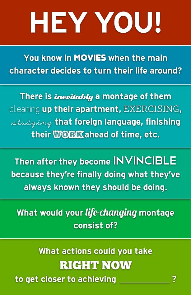 Hey You! You know in movies when the main character decides to turn their life around? There is inevitably a montage of them cleaning up their apartment, exercising, studying that foreign language, finishing their work ahead of time, etc. Then after they become invincible because they’re finally doing what they’ve always known they should be doing. What would your life-changing montage consist of? What actions could you take RIGHT NOW to get closer to achieving ___________ ?